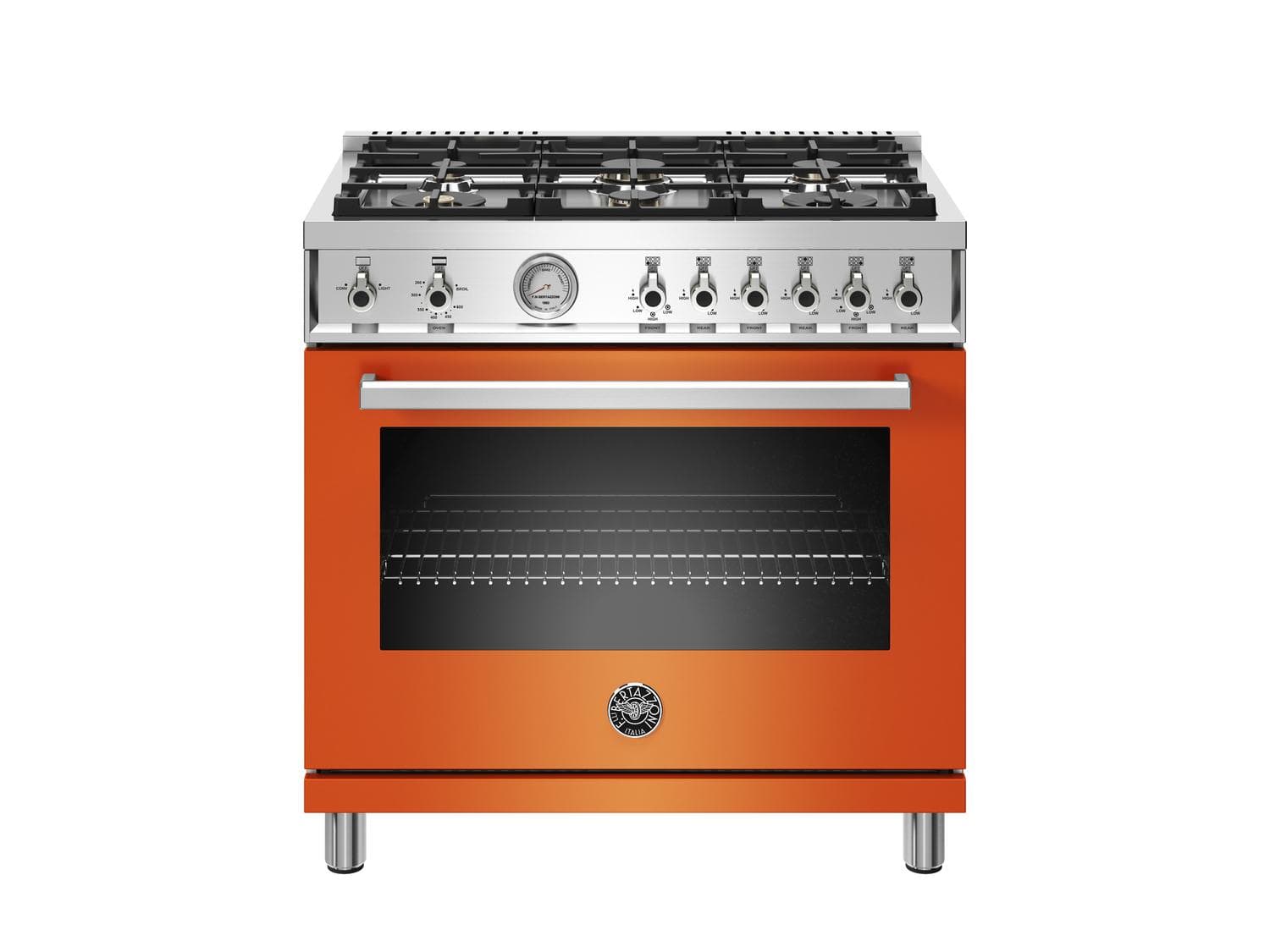 Bertazzoni 36 inch All Gas Range with 6 Sealed Burners, 5.9 Cu. Ft. Oven Capacity, Continuous Grates, Elegant Temperature Gauge, 19000 BTU Power Burners - Arancio Orange