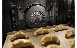 features a unique bow-tie design with heating element and fan that provide even airflow and consistent temperatures throughout the entire oven for crisp, flaky baked goods, juicy, evenly browned roasts and flavorful, caramelized vegetables.