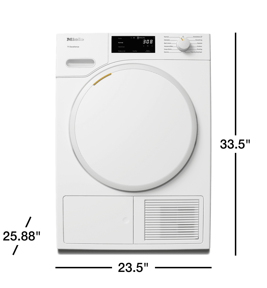 The Miele 24" Smart Heat Pump Dryer with 4.02 cu. ft. Capacity, available at Airport Appliance, redefines the drying experience with its innovative features, advanced technology, and spacious capacity. Crafted with precision engineering and Miele's renowned attention to detail, this dryer delivers exceptional drying performance while maintaining energy efficiency and garment care. The Miele TXD160WP Smart Heat Pump Dryer combines cutting-edge technology with an elegant design to provide optimal drying results. With a generous capacity of 4.02 cu. ft., it offers ample space for drying large loads of laundry, making it ideal for families and households with heavy laundry needs. The dryer's compact 24" width allows for flexible installation options, making it suitable for a variety of laundry room configurations. Equipped with Miele's innovative heat pump technology, this dryer offers gentle yet efficient drying, ensuring that your clothes are dried evenly and without damage. The heat pump system recycles heat during the drying process, resulting in lower energy consumption and reduced environmental impact compared to traditional dryers. Additionally, the dryer features Miele's PerfectDry system, which automatically adjusts the drying time based on the moisture level of the laundry, ensuring optimal results every time. This product is part of the luxury sub-category and premium sub-category series.