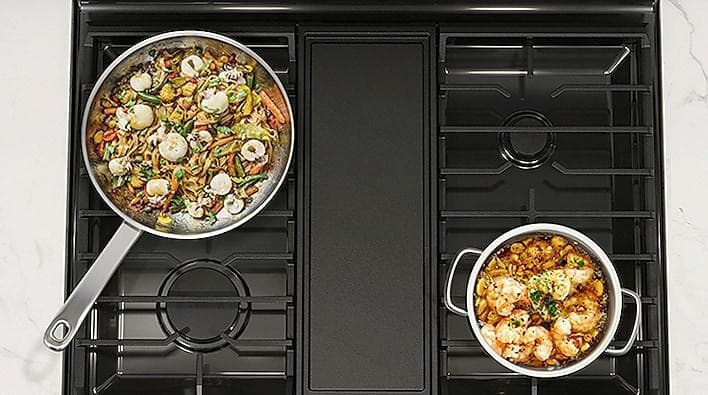 This 5-burner cooktop includes 2 power burners and cast iron edge-to-edge grates so you can slide pots and pans across more usable cooktop space. User the simmer burner to cook your favorite sauces.