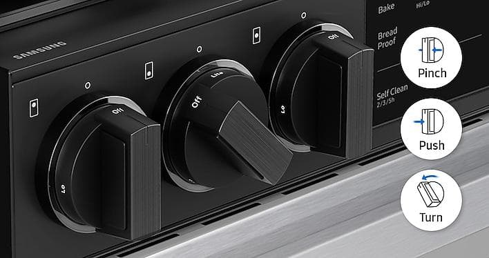 Precisely control and ensure proper activation of your cooktop with integrated knob buttons that must be pinched in before the knobs can be pushed and turned.
