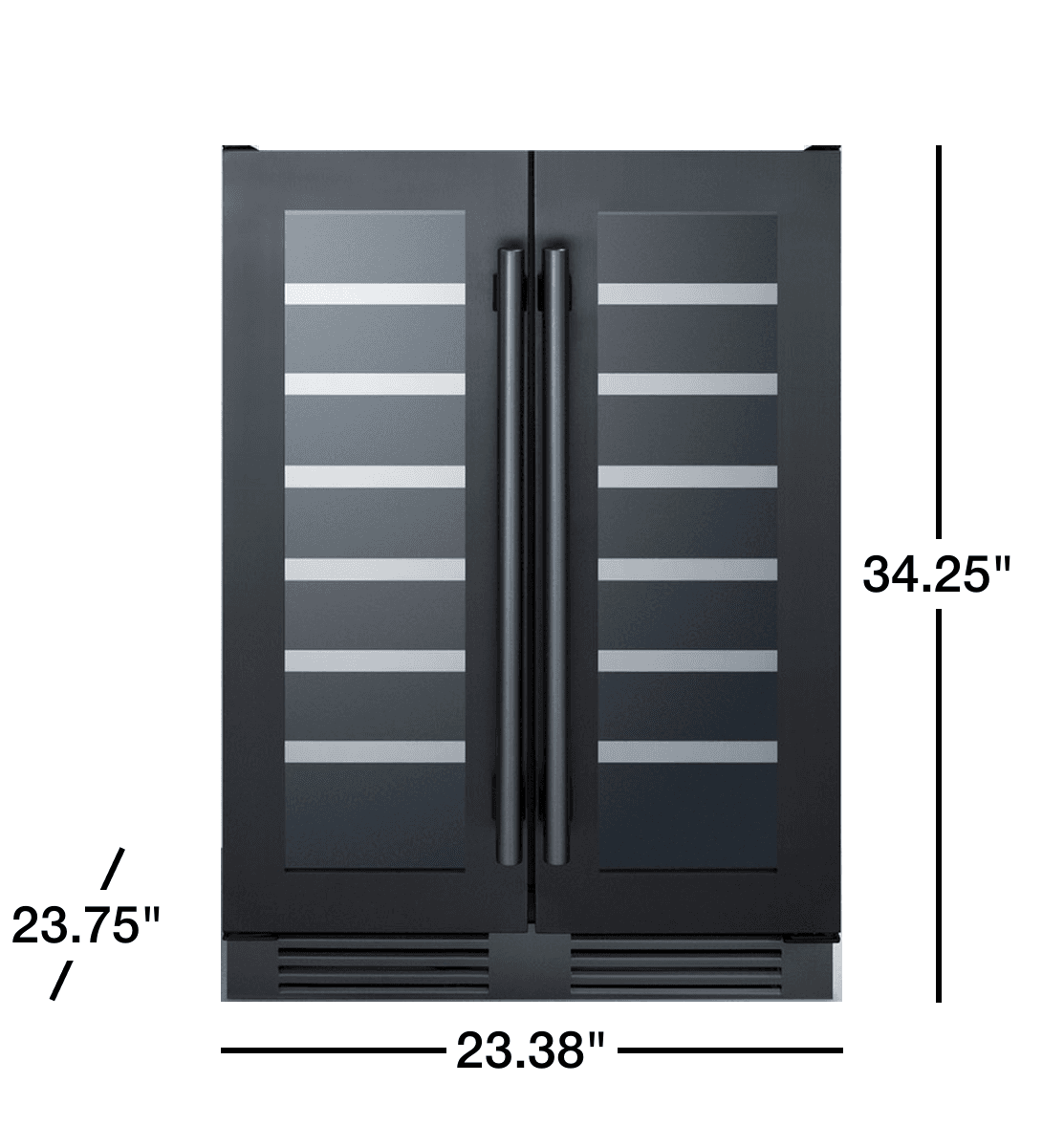 Summit's extensive collection of built-in undercounter wine cellars includes unique choices for virtually every space. Sized for 24" wide spaces, the SWC24GKS is a dual-zone wine cellar with a front-breathing design suitable for built-in installation. It also features a fully finished black cabinet that allows for freestanding use. The French door swing adds a dramatic look under the counter, with a fingerprint-proof black matte finish on the 304-grade stainless steel door trim. The handles and kickplate feature a brushed stainless steel finish in a smoky hue for a unique, modern accent. Inside, the SWC24GKS includes full-extension stainless steel-trimmed wooden shelves on rollers for easy loading. Digital controls make it easy to manage both temperature zones, with a readout viewable in Celsius or Fahrenheit. Each zone can be set for red or white wine storage, and the unit can store up to 42 standard Bordeaux-style bottles. To accommodate wider Burgundy-style wine bottles, you can remove every other shelf for a better fit. Each compartment includes an active charcoal filter to help preserve your collection. The walls feature white LED lighting that can be set to turn on with the open doors or to stay on in presentation mode for a gentle, efficient glow. This unit is equipped with both an open door and high/low-temperature alarm for added protection of your wine. With its unique design and user-friendly features, the SWC24GKS lets you finish any undercounter space in a modern style.