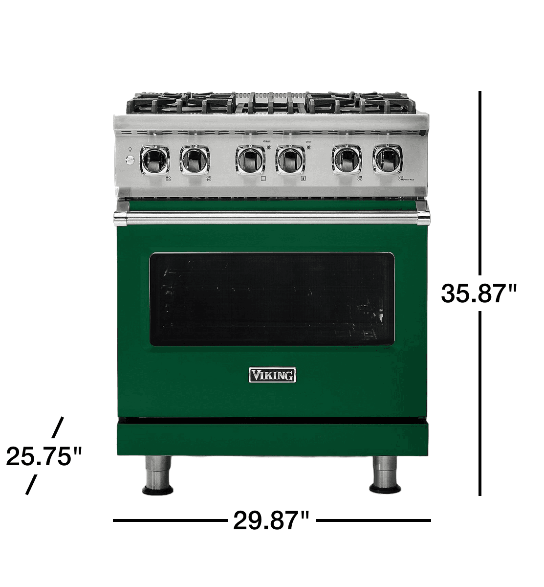 -Elevate your culinary experience with the Viking 30"W./24"D. Dual Fuel Self-Clean Sealed Burner Range, a masterpiece of design and functionality. This premium range, model VDR5304BIVLP, is finished in a sophisticated Ivy hue, adding a touch of elegance to any kitchen decor.