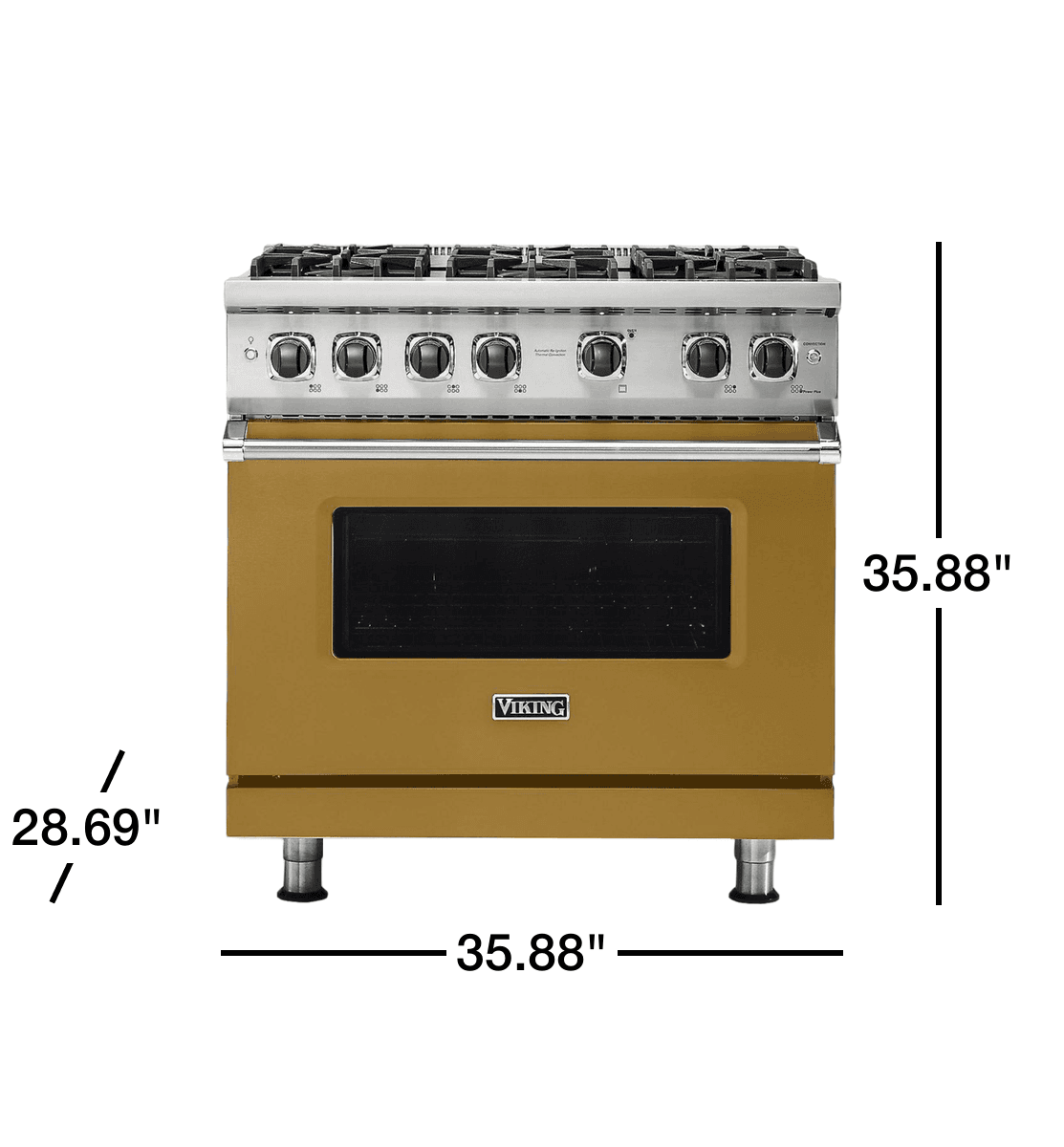 -Elevate your culinary experience with the Viking 36"W./24"D. Gas Sealed Burner Range, a masterpiece of design and functionality. This premium range, adorned in the stunning Golden Hour finish, is not just an appliance but a statement piece for your kitchen. This product is part of the luxury sub-category and premium sub-category series.