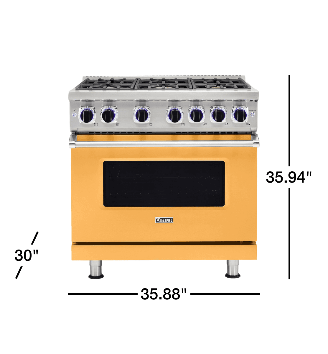 Whether you're a professional chef or a home cooking enthusiast, the Viking 36"W./24"D. Gas Sealed Burner Range in Daffodil is the perfect addition to your kitchen, combining exceptional performance with eye-catching design. Transform your cooking space and unleash your culinary creativity with this outstanding range.