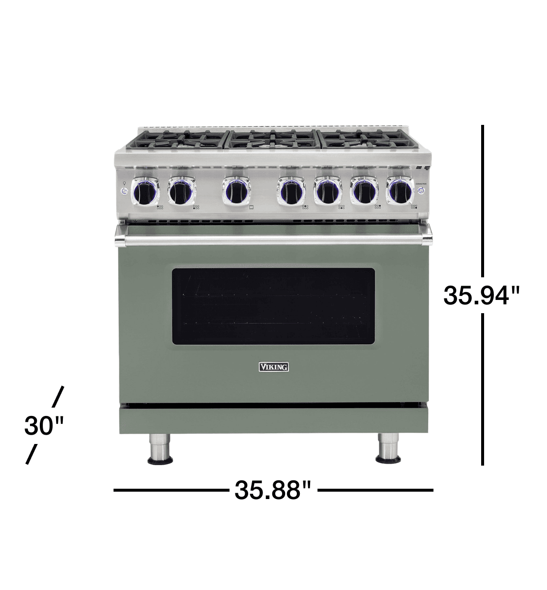 Whether you're a seasoned chef or a passionate home cook, the Viking 36"W./24"D. Gas Sealed Burner Range with six burners in Eucalyptus is the perfect addition to your kitchen. Experience the blend of style, performance, and reliability that only Viking can deliver. Transform your cooking space and unleash your culinary potential with this exceptional range.