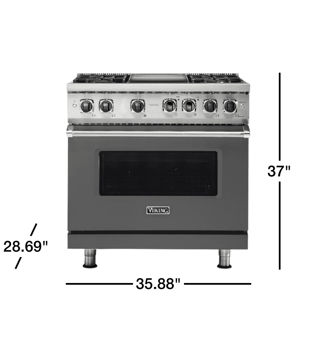 "Viking 36""W./24""D. Dual Fuel Self-Clean Sealed Burner Range - 4 Burners/Griddle - Damascus Gray - LP VDR5364GDGLP -Elevate your culinary experience with the Viking 36""W./24""D. Dual Fuel Self-Clean Sealed Burner Range, a masterpiece of design and functionality. This premium range, finished in an elegant Damascus Gray, seamlessly blends style with performance, making it a stunning centerpiece for any modern kitchen.