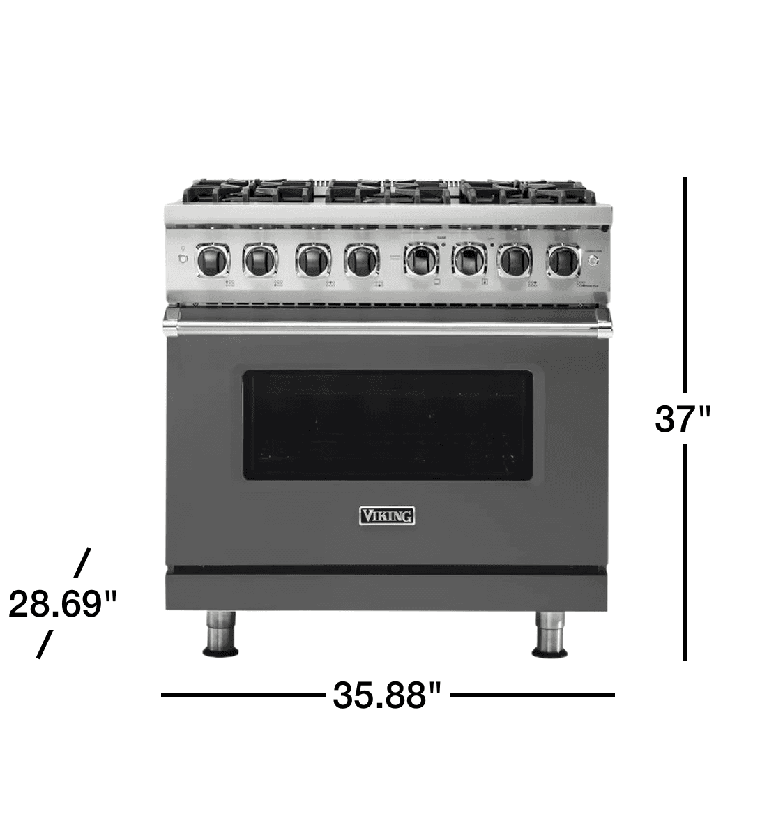 -Elevate your culinary experience with the Viking 36""W./24""D. Dual Fuel Self-Clean Sealed Burner Range in a stunning Damascus Gray finish. This premium range is designed for the discerning chef who demands both style and performance in the kitchen.