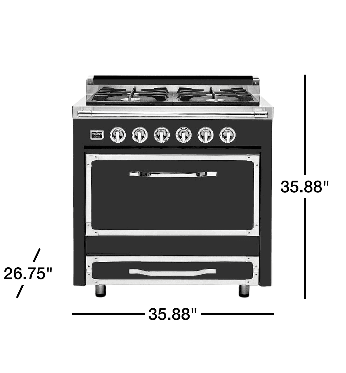 Viking 36"W. Tuscany Dual Fuel Range with 4 Sealed Burners, 3.8 Cu. Ft. Capacity, Storage Drawer, Continuous Grates, Tru Convection, Defrost - Cast Black