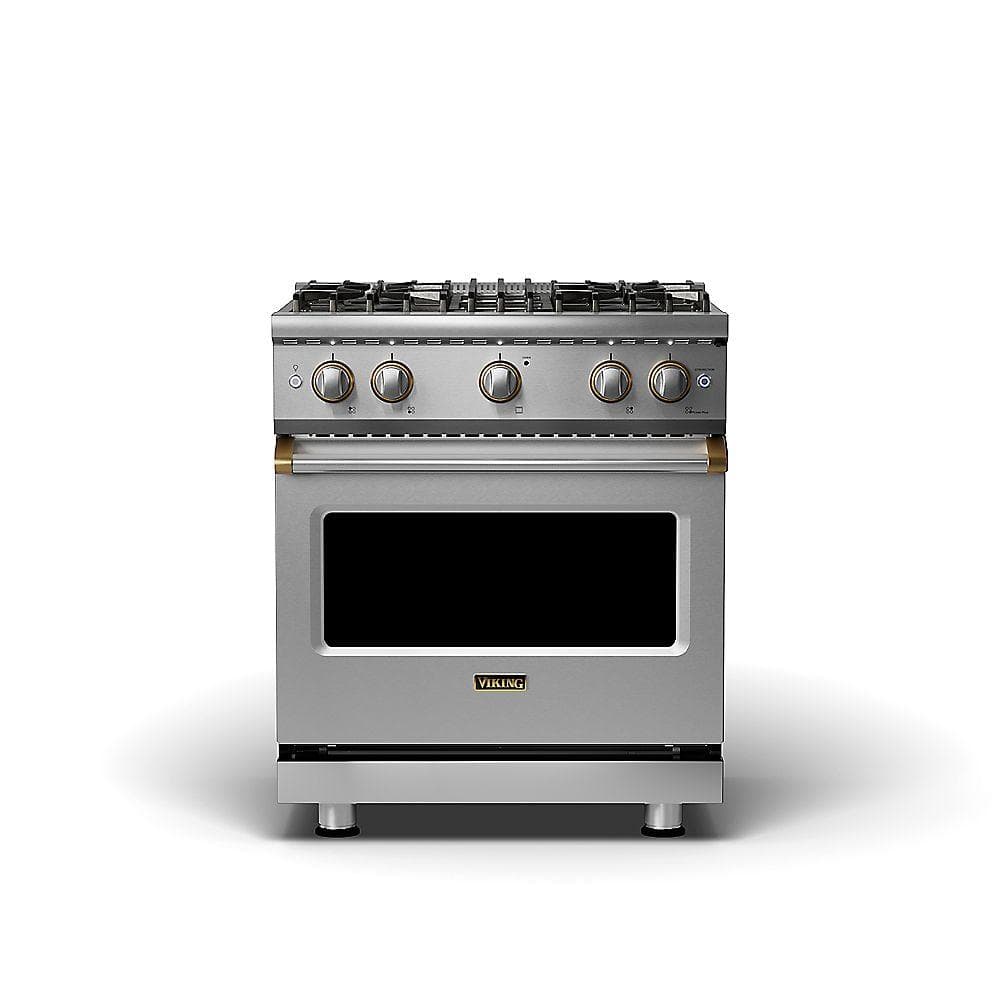 Viking 5 Series 30 Inch Freestanding Professional Gas Range with 4 Sealed Burners, 4.0 Cu. Ft. Capacity, Continuous Grates, VSH™ Pro Sealed Burner System, ProFlow™ Convection Baffle, and TruPowerPlus™ Burner: Stainless Steel w/ Brass Bezels - Natural Gas