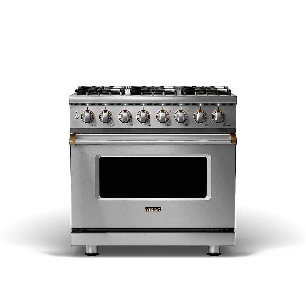 Viking 5 Series 36 Inch Freestanding Dual Fuel Range with 6 Sealed Burners, 5.6 Cu. Ft. Capacity, Self-Cleaning, Vari-Speed Dual Flow™ Convection, SoftLit™ LED Light, TruPower Plus™ Burner and Star-K Certified: Stainless Steel with Brass Bezels, Liquid Propane
