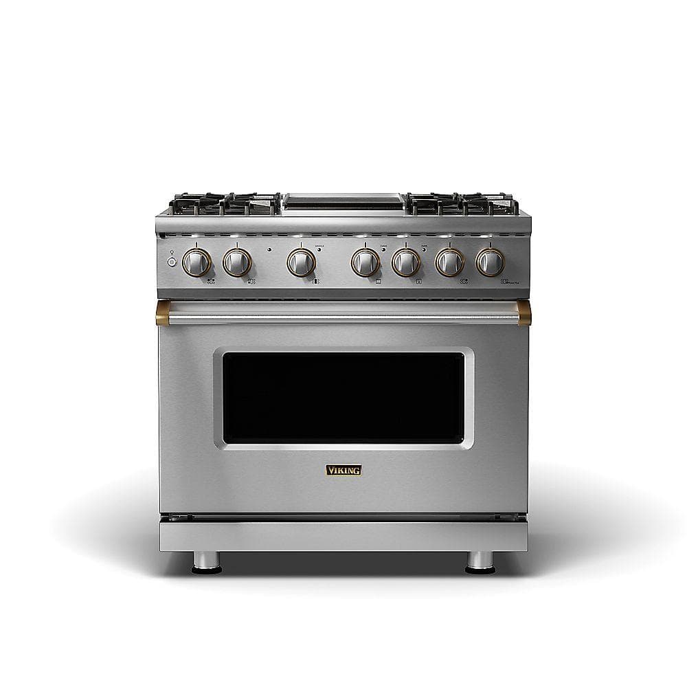 The Viking 5 Series 36 Inch Freestanding Professional Dual Fuel Range (SKU: VDR5364GSSBBLP) features a durable stainless steel exterior with elegant brass bezels, combining modern design with industrial strength.
