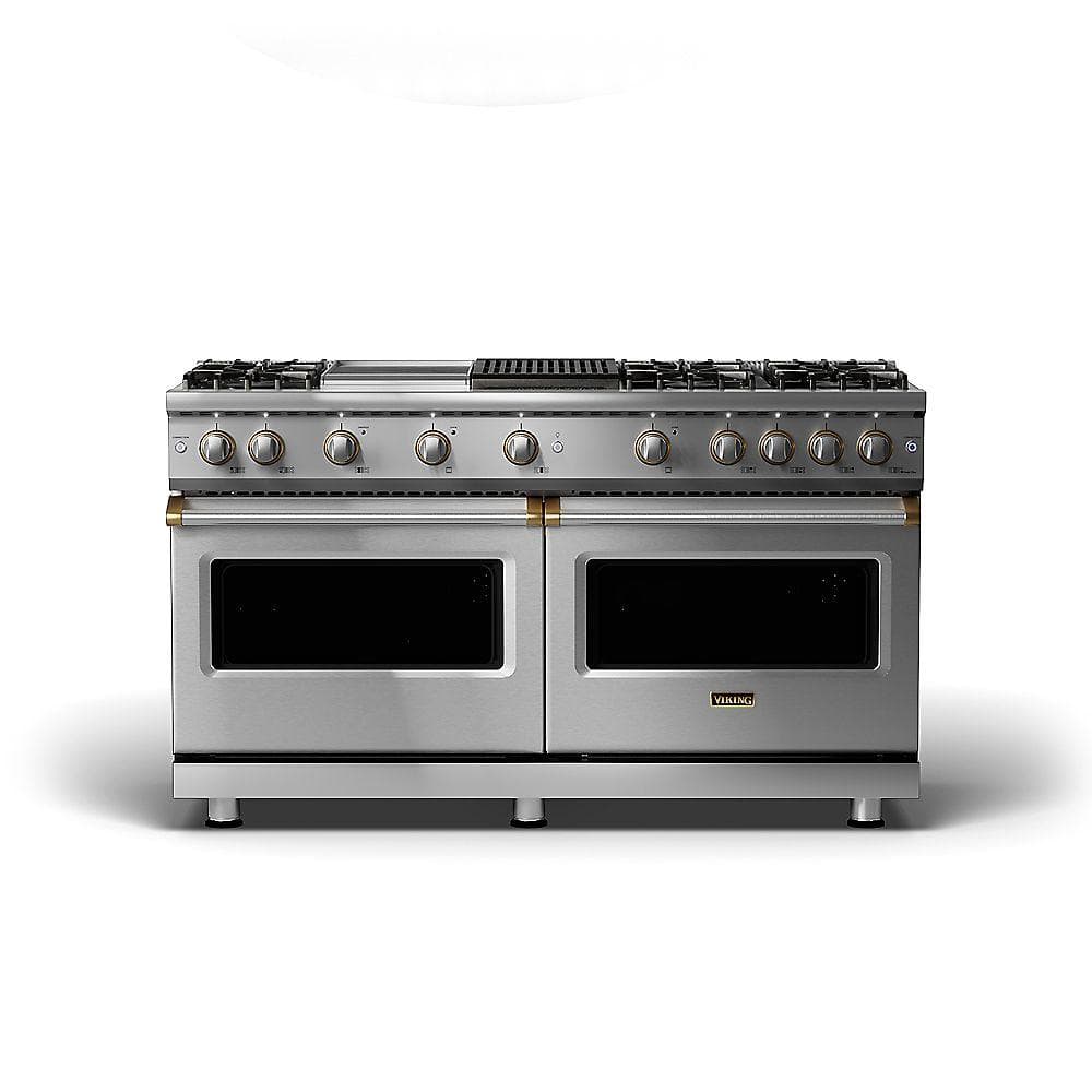 Viking 5 Series 60 Inch Freestanding Gas Range with 6 Sealed Burners, 8 cu. ft. Total Oven Capacity, Double Ovens, ProFlow™ Convection, Gourmet-Glo™ Broiler, Griddle, Grill, VSH™ Burner System, VariSimmer™, SureSpark™ Ignition and TruGlide™ Rack: Stainless Steel with Brass Bezels, Liquid Propane