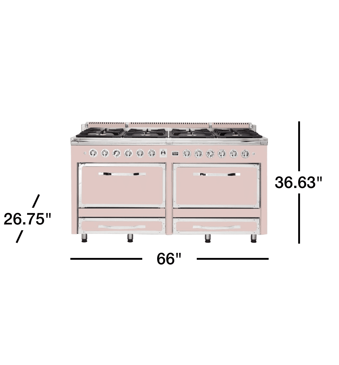 -Elevate your culinary experience with the Viking Tuscany 66"" Dual Fuel Range, a masterpiece of design and functionality. This stunning range, finished in an elegant blush hue, seamlessly blends timeless Italian craftsmanship with modern innovation, making it the centerpiece of any luxury kitchen.