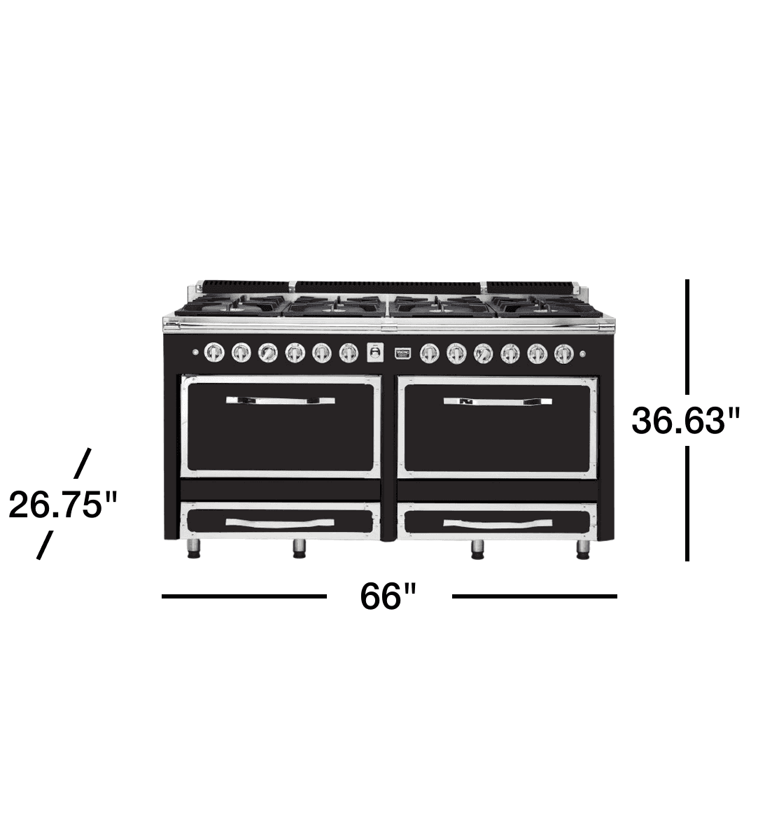 VIKING 66"W. Tuscany Dual Fuel Range with 8 Sealed Burners, 7.6 cu. ft. Total Capacity, Storage Drawer, and 8 Cooking Functions - Onyx