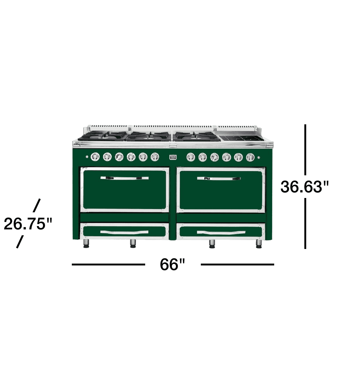 Viking 66"W. Tuscany Dual Fuel Range with High Performance Burners, Electronic Single Spark Ignition, Storage Drawer, Convection Bake, Tru Convection, Low Broil, High Broil - Ivy